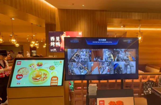 这意味着顾客能够云监工,通过门店电视屏“明厨亮灶”的曲播,旁不雅后厨切肉、炒菜、送餐、烤肉等动态。